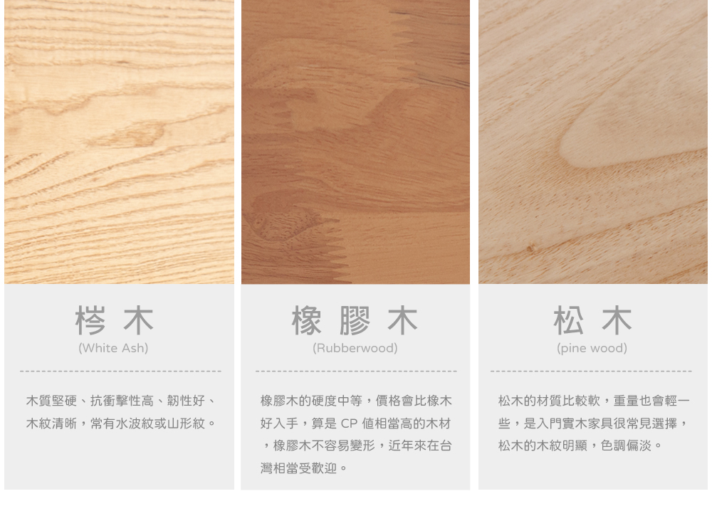 橡膠木的硬度中等,價格會比橡木好入手,算是 CP 值相當高的木材,橡膠木不容易變形,近年來在台灣相當受歡迎,外觀偏淺木色,適合多種室內風格,不過抗潮性和抗蟲程度就比教普通,需要留意擺放的位置讓床架保持通風。