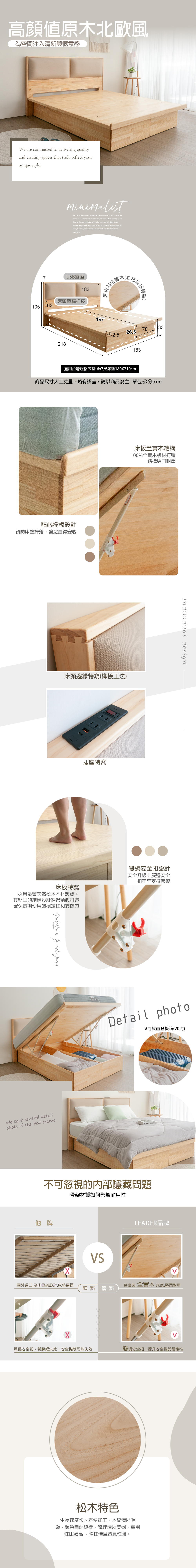 規格:寬183X深218X床頭高105,床底高33CM/內框:寬78X深197X高26.5CM(一格)