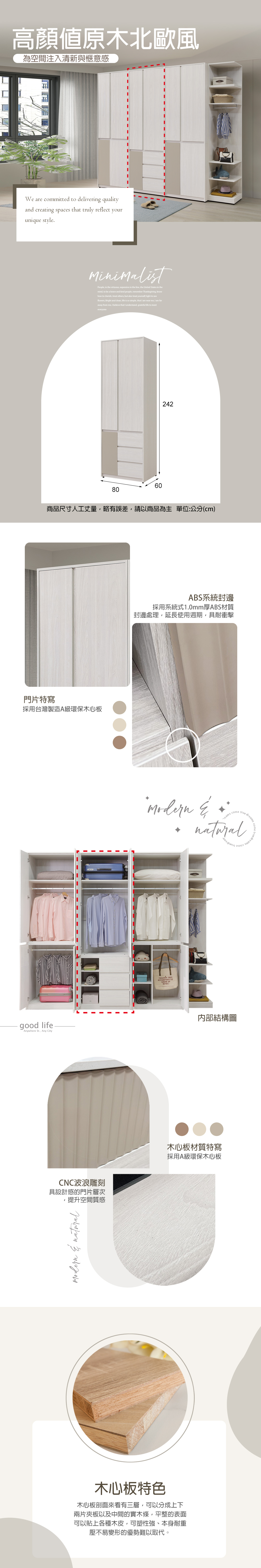 1.正面採MDF材質經CNC波浪雕刻,奶油色烤漆全包覆處理2.櫃體與抽牆採用台灣製造A級環保木心板,採專利技術同調木紋鋼刷壓紋,猶如實木質感3.採用系統式1.0mm厚ABS材質封邊處理,質感細緻延長使用週期,具耐衝擊特質4.抽屜採用台灣製鋼珠滑軌,門片採用油壓緩衝鉸鏈5.背板採用內崁式美背處理,美觀又細緻6.台灣製造