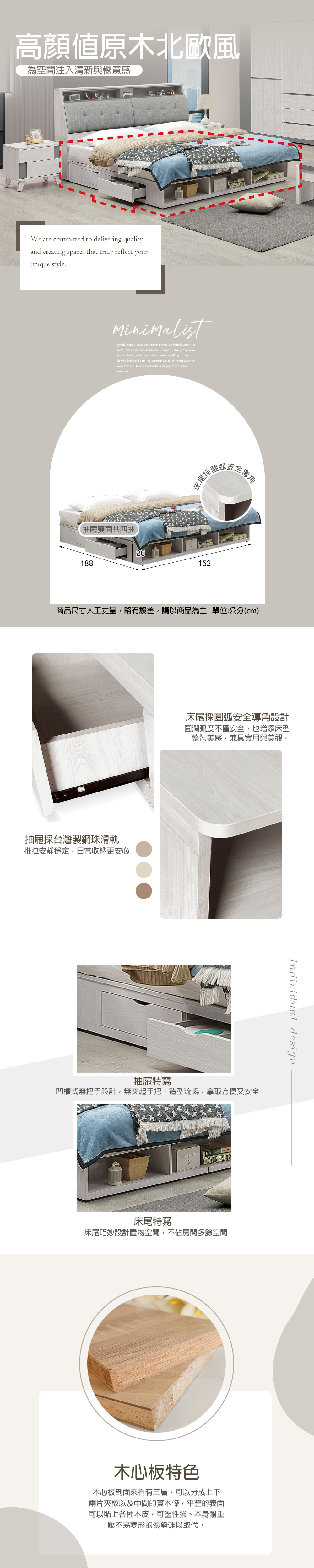 1.正面、檯面、側板與抽牆採用台灣製造A級環保木心板採專利技術同調木紋鋼刷壓紋,猶如實木質感