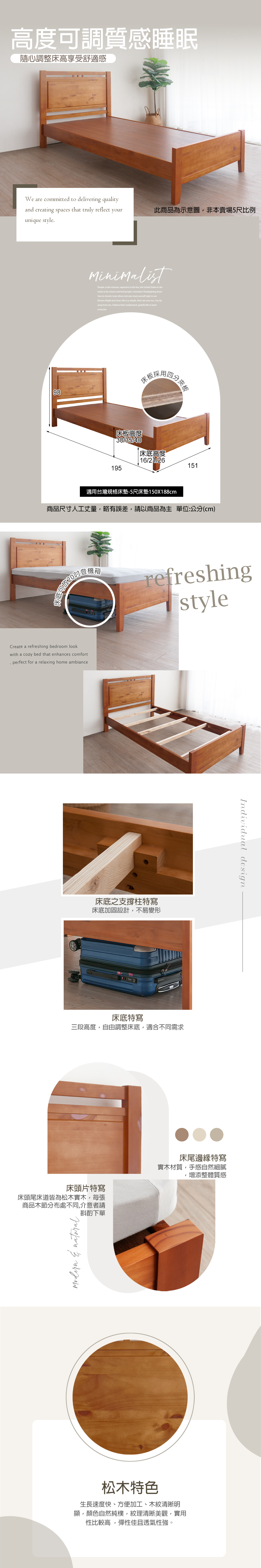 床頭尾床道皆為松木實木,表面採優利坦處理、具耐磨特性