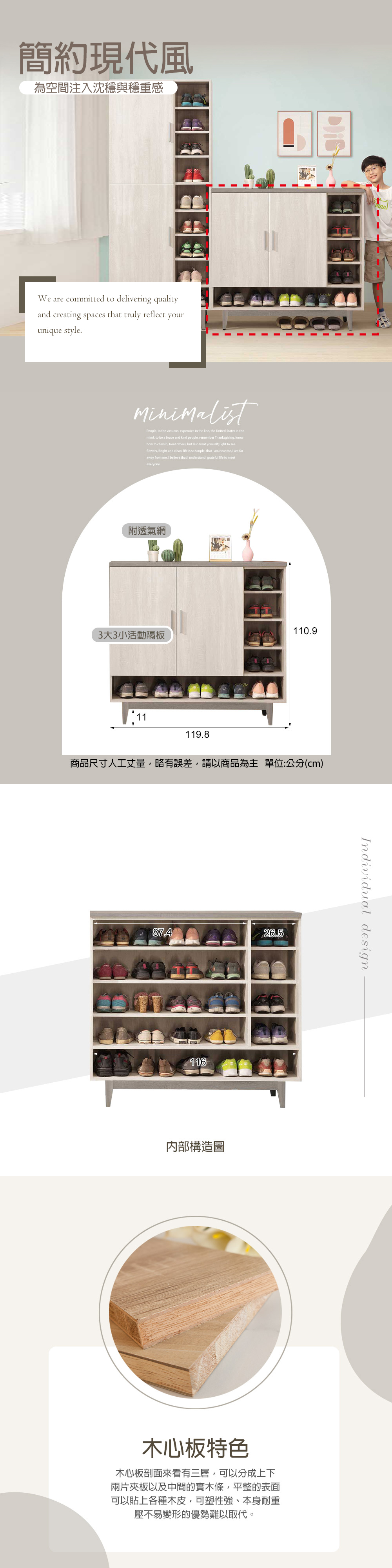 材質:正面.側板採用符合國際標準 F3 低甲醇防蛀木心板全包式材質,面板採用 MDF 同調壓紋立體浮雕強化耐磨皮,耐水材質,內部防污塗裝