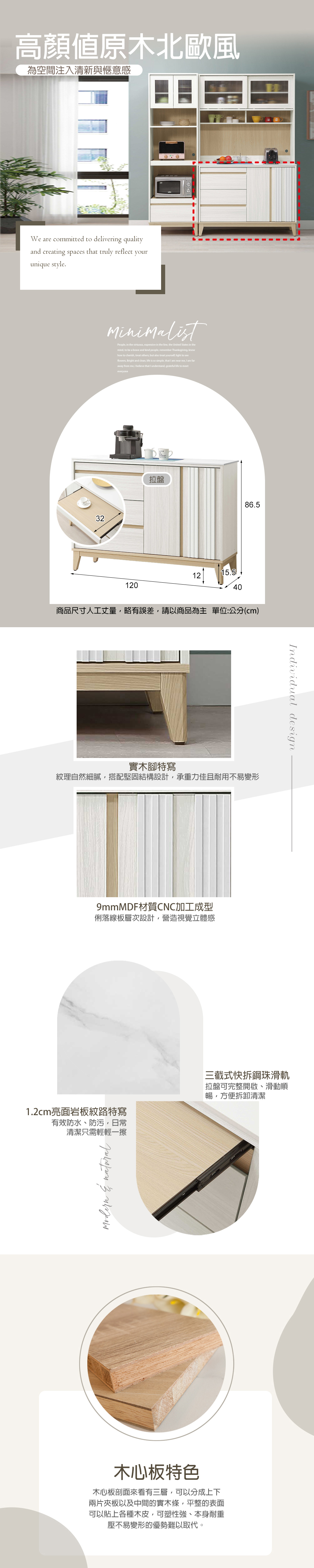 材質:正面.側板.桌面採用國際低甲醛木心板塗裝:採用PU.耐磨塗裝岩板:亮面岩板 1.2cm(岩板特性 :高強度.耐磨耐刮.耐高溫.易清潔)五金:抽屜採用三截式快拆鋼珠滑軌後鈕:採用不鏽鋼油壓緩衝後鈕腳座:採用實木製成弧度支撐實木腳柱,腳高 15.5cm,下緣高度12cm實木:腳柱下之腳粒全為可調整式腳粒背板:採用美背處理備註:附1片活動隔板