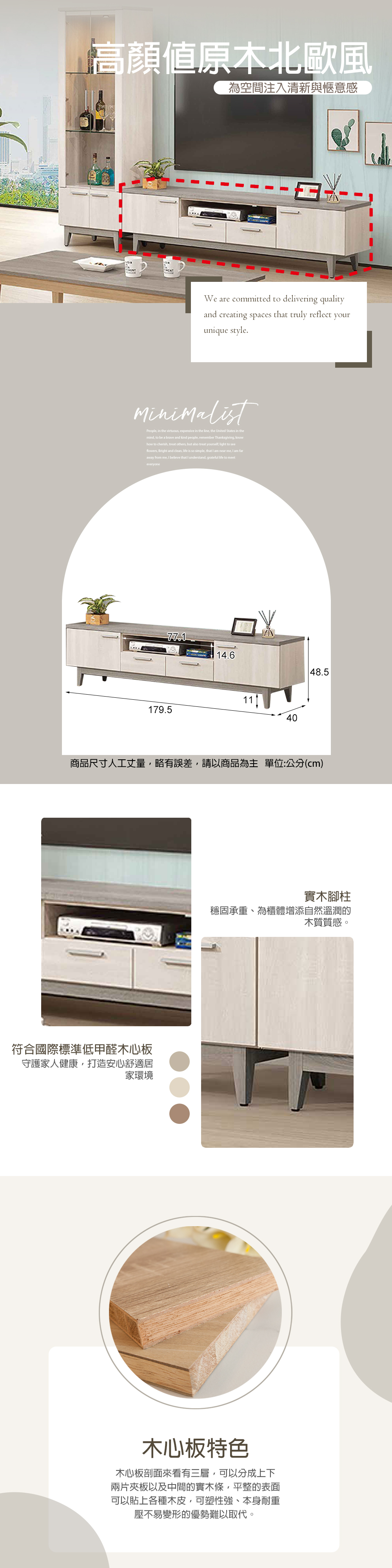 材質:正面.側板採用符合國際標準 F3 低甲醇防蛀木心板全包式材質,面板採用 MDF 同調壓紋立體浮雕強化耐磨皮 .耐水材質,內部防污塗裝五金:抽屜採高級鋼珠滑軌,鉸鍊採高級油壓緩衝鉸鍊把手:採簡約設計感,鋁製實心超硬度材質腳座:採用實木製成斜度支撐實木腳柱實木:腳柱下之腳粒全為可調式升降腳粒.腳高11cm背板:採嵌入式美背處理備註:附1個電線孔/開門內無隔板