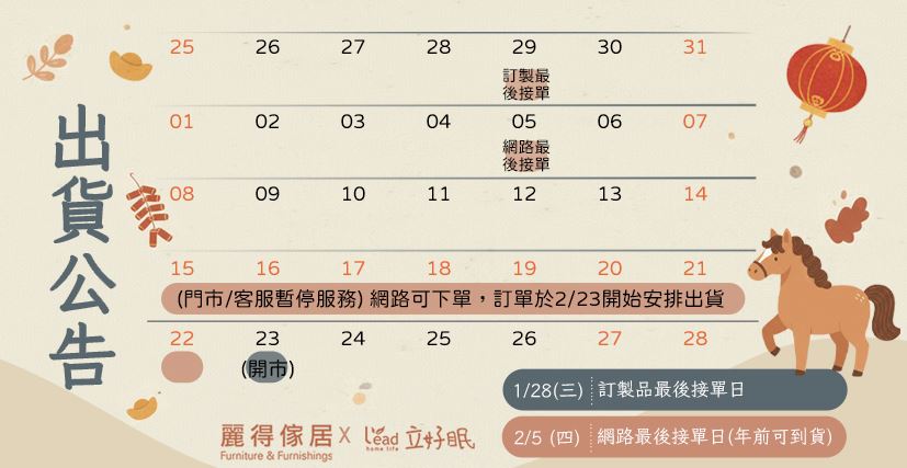 門市網路休息日:2/15-2/22(網路可正常下單,訂單於2/23開始安排出貨)