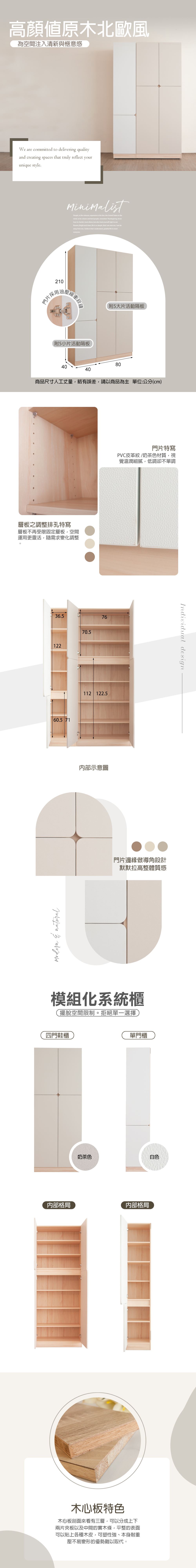 材質:1.採全環保木心板包含抽牆,經立體木紋耐磨塗裝,PVC耐磨耐水(白色/奶茶色)2.採系統式1.5mm厚封邊處理3.門片採用油壓緩衝後鈕,可自動收合4.背板採用崁入式美背設計5.台灣製造 備註:1.3x7尺單門櫃:附5小片活動隔板2.7x7尺四門櫃:附5大片活動隔板