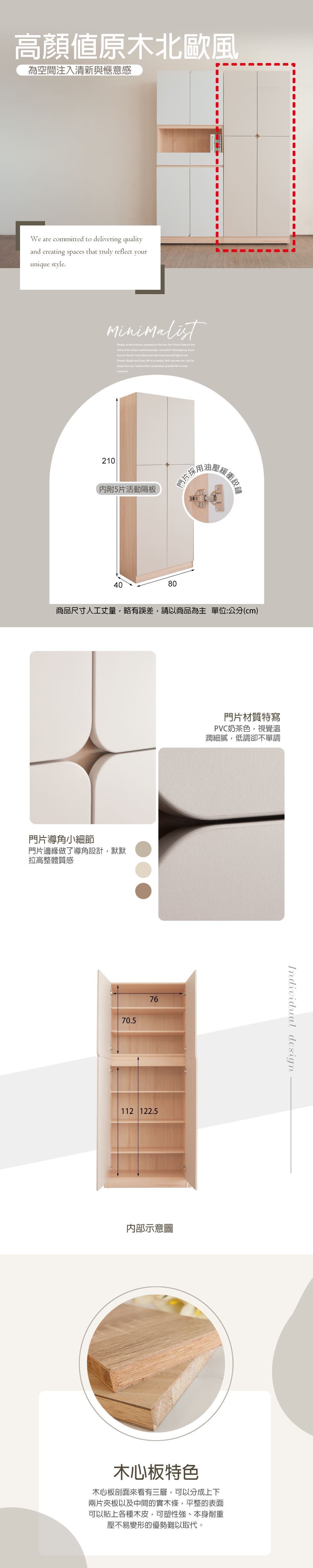 材質:1.採全環保木心板包含抽牆,經立體木紋耐磨塗裝,PVC耐磨耐水(奶茶色)2.採系統式1.5mm厚封邊處理3.門片採用油壓緩衝後鈕,可自動收合4.背板採用崁入式美背設計5.台灣製造備註:附5大片活動隔板