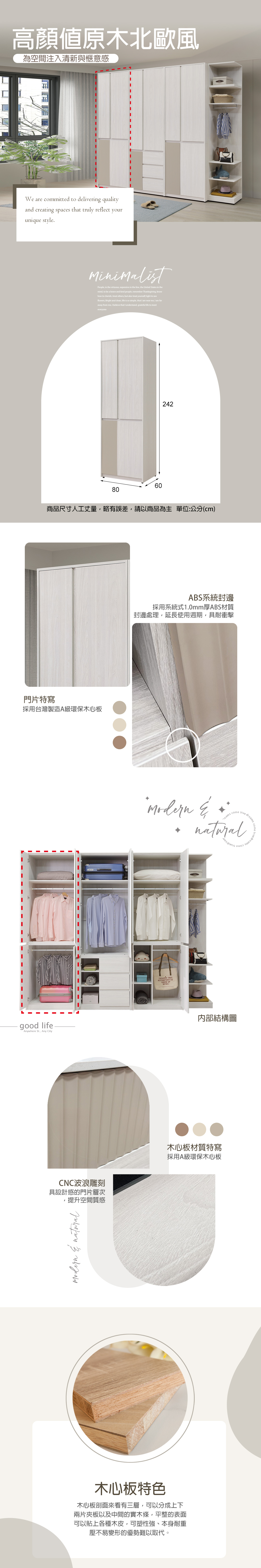 2.櫃體與抽牆採用台灣製造A級環保木心板,採專利技術同調木紋鋼刷壓紋,猶如實木質感