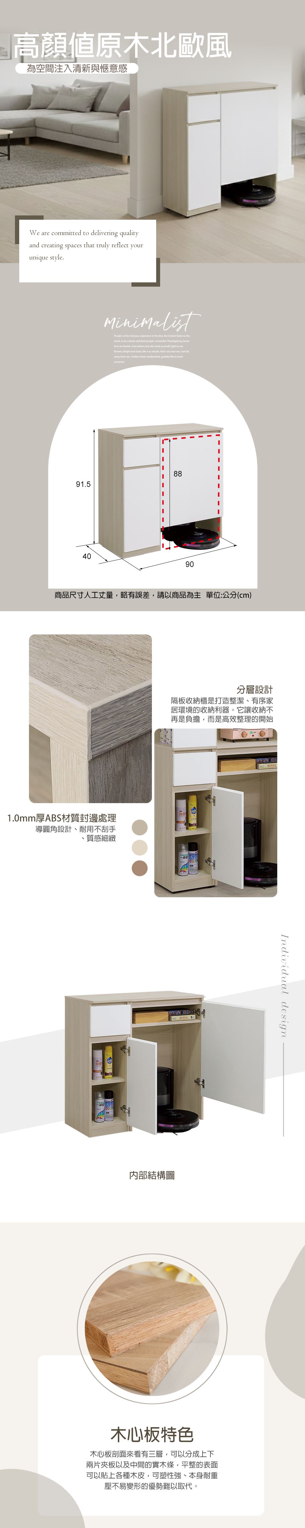 規格:寬90X深40X高91.5CM, 掃地機內高73CM上方活動層板可拿下(拿掉後總和高88CM)