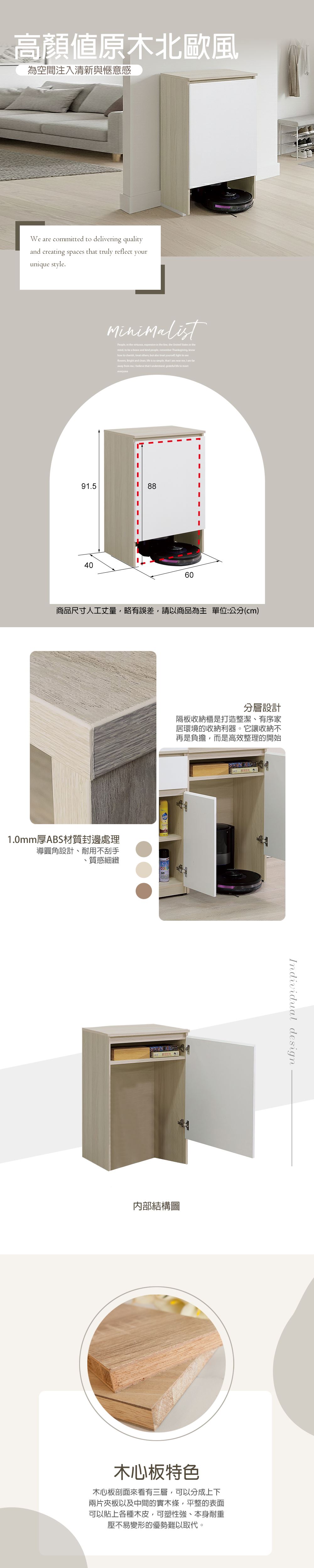 規格:寬60X深40X高91.5CM, 掃地機內高73CM上方活動層板可拿下(拿掉後總和高88CM)