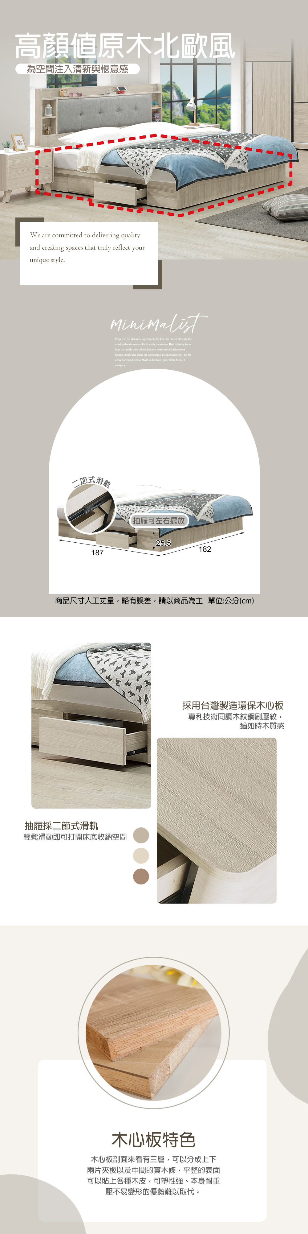 1.正面、側板與抽牆採用台灣製造A級環保木心板,專利技術同調木紋鋼刷壓紋,猶如實木質感