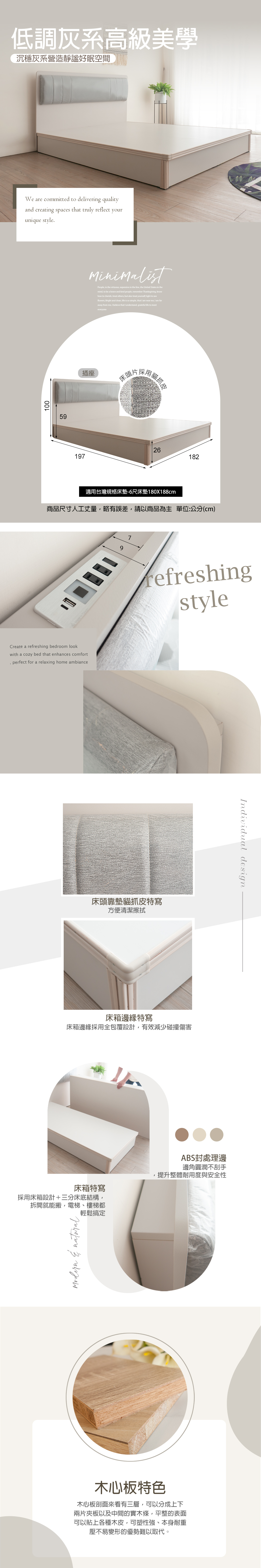 • 規格:6尺:寬182x深197x高100(公分);床底高26(公分);床頭片厚度9(公分)