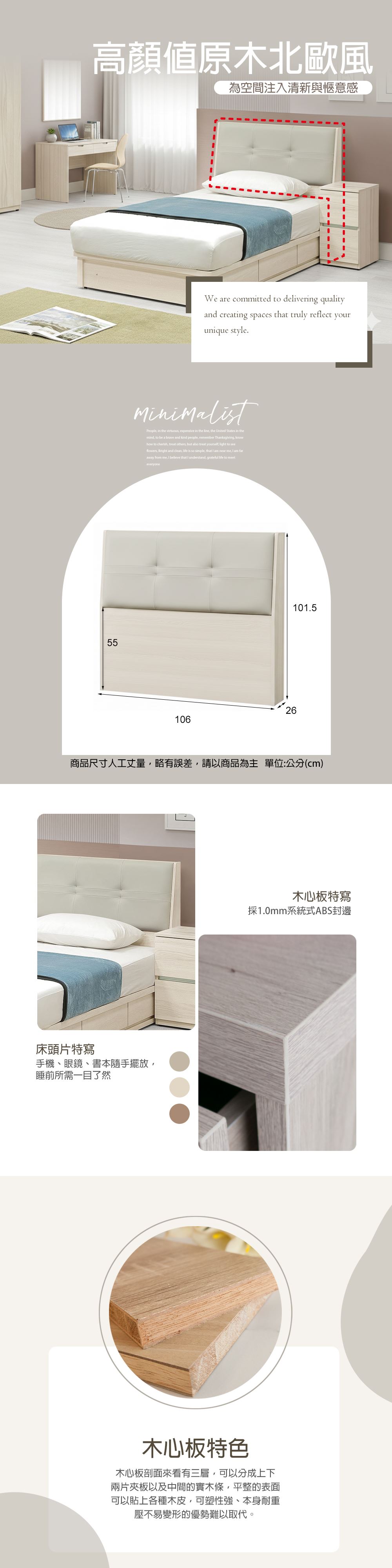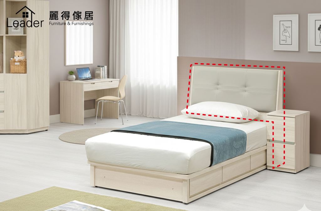材質:採用台灣製造防蛀環保低甲醛木心板.表面PVC耐磨耐水浮雕木紋紙.正面及面板採用 1.0mm ABS 床片靠墊:採用仿牛皮紋耐磨皮抽屜:採用三節鋼珠滑軌後鈕:採用白鐵油壓緩衝後鈕背板:採釘附式美背處理備註:(下緣高度58cm.附插座)(上方可收納.下方不可收納)