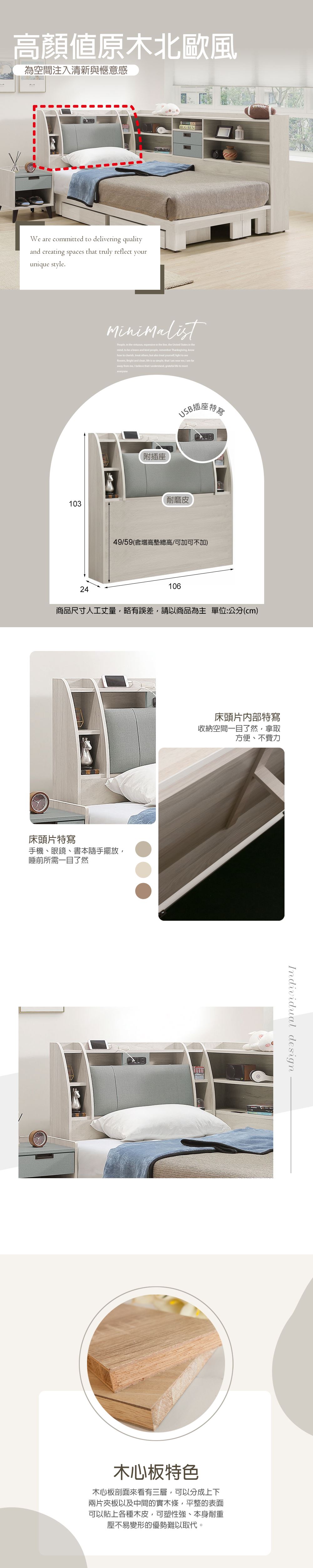 床頭箱:USB3.1 系統家具式 ABS 材質加厚封邊,圓弧導圓