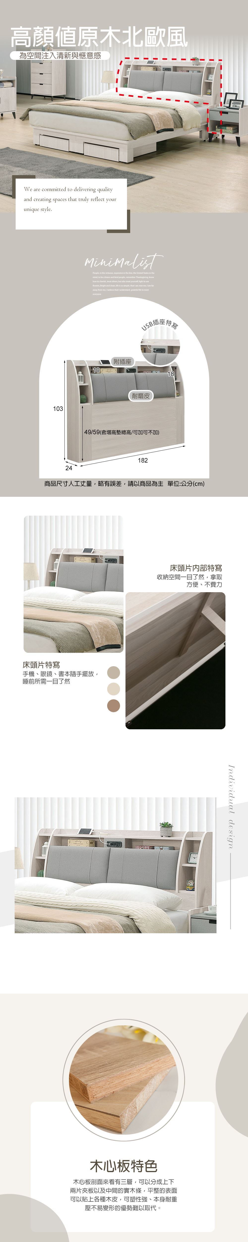 材質:採用符合國際標準低甲醛防蛀木心板 . 耐磨材質.ABS材質加厚封邊床頭片:附有雙孔二插式插座抽屜:為內斜式手把後鈕:採用油壓緩衝後鈕背板:採釘附式美背處理特色:床底盒底部裝萬向輪.可自由正面或側面擺放備註:(下緣高度49cm.可收納)(贈送10cm增高墊.加與不加都可)(含增高墊下緣總高59cm
