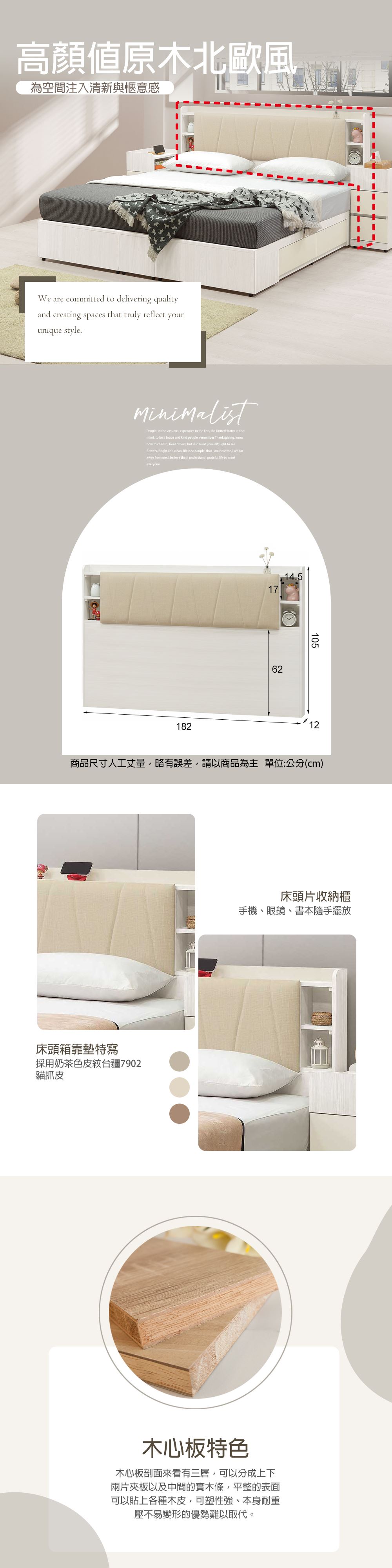 材質:正面採用奶茶色皮紋 PVC. 全木心板材質;床頭靠墊及化妝椅墊為台疆7902貓抓皮