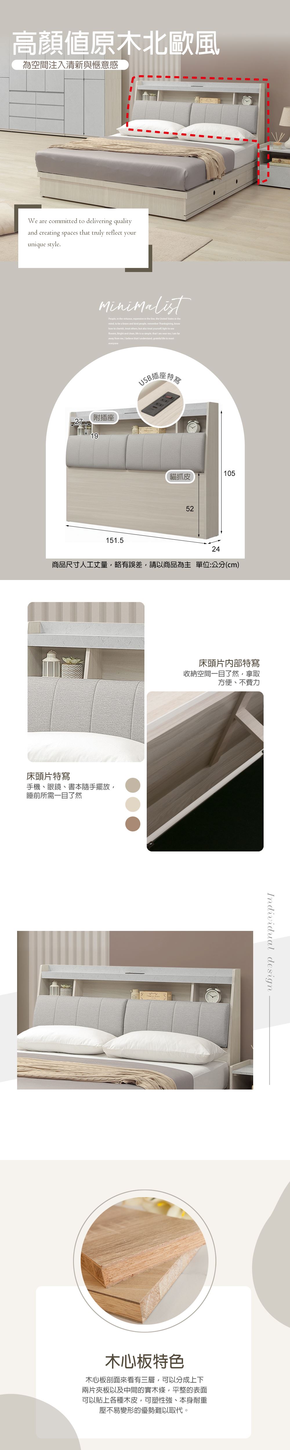 材質:採用符合標準低甲醛 A 級防蛀木心板貼含浸超耐磨紙桌面 . 正面為美耐皿材質 .ABS1.0mm 封邊門片 . 抽頭斜邊手把設計床頭箱:背墊及化妝椅皮墊,採用日本鬼洗尚慶 Y8311 貓抓皮抽屜:採用鋼珠滑軌後鈕採用油壓緩衝後鈕背板:採釘附式美背處理備註:下緣高度52cm.可收納