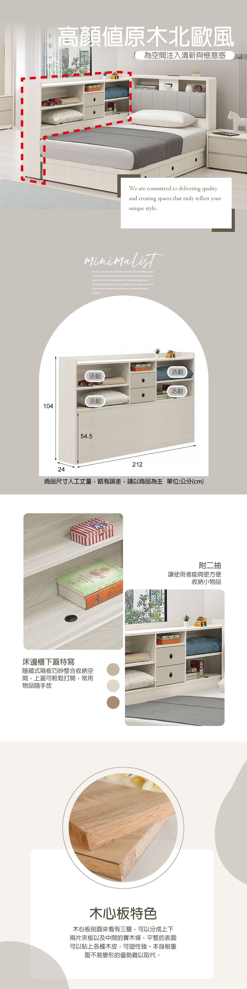 材質:高級防蛀全木心板 ( 符合國際標準低甲醛 )塗裝:耐磨耐水木紋紙 ( 梣木 ) 與 PVC 耐磨耐水 ( 奶茶色 )的巧妙搭配,猶如進入唯美浪漫的空間 (NOP,符合加州 65 水案 )封邊:床頭與三抽床底為一般封邊滑軌:三節式鋼珠滑軌背板:釘附式美背處理備註:掀蓋下緣高度54.5cm.可收納
