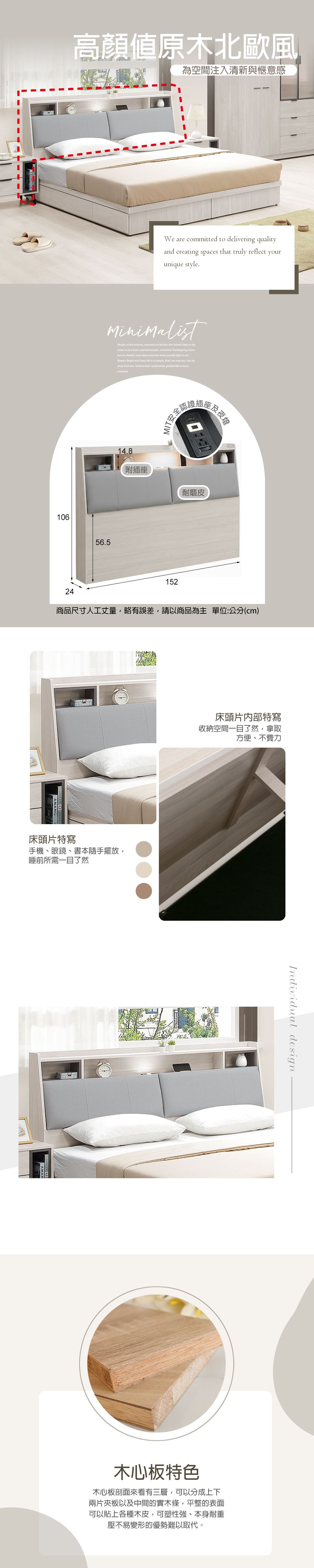 5尺(USB夜燈)床頭箱 標準雙人床頭背板 床頭 【275A2633】275-M352