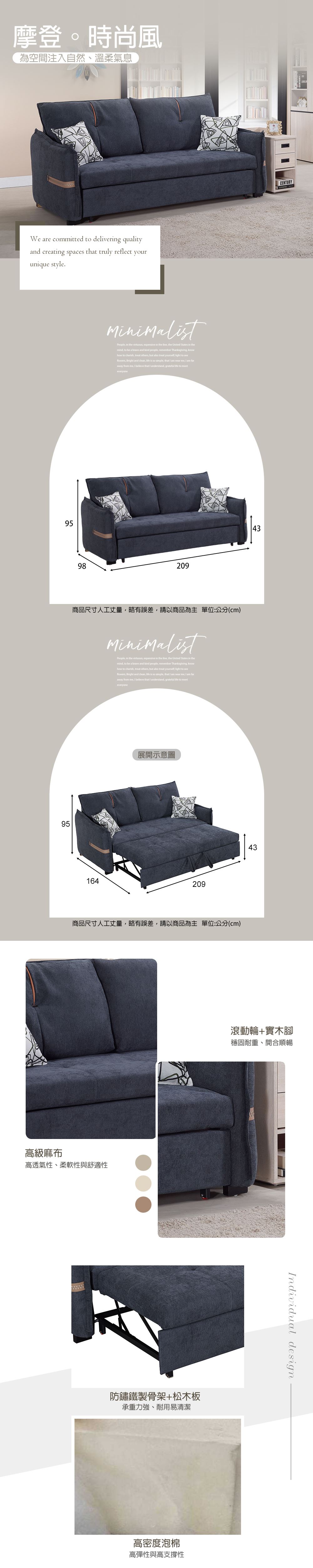 收合:寬209×深98×高95(80)(公分)