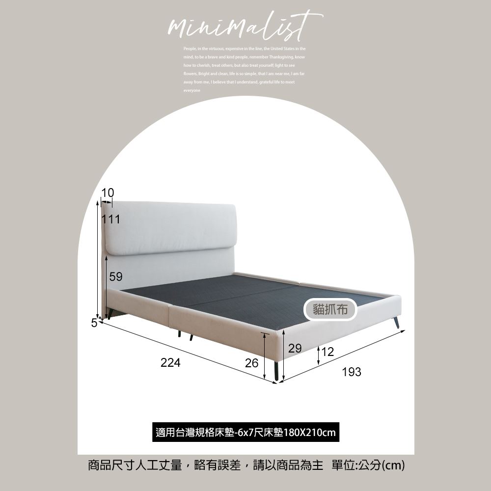 6x7尺(床頭片+床底):寬195X深224X高111CM(下緣到地面高度59cm)X床底高29CM(內高26cm)