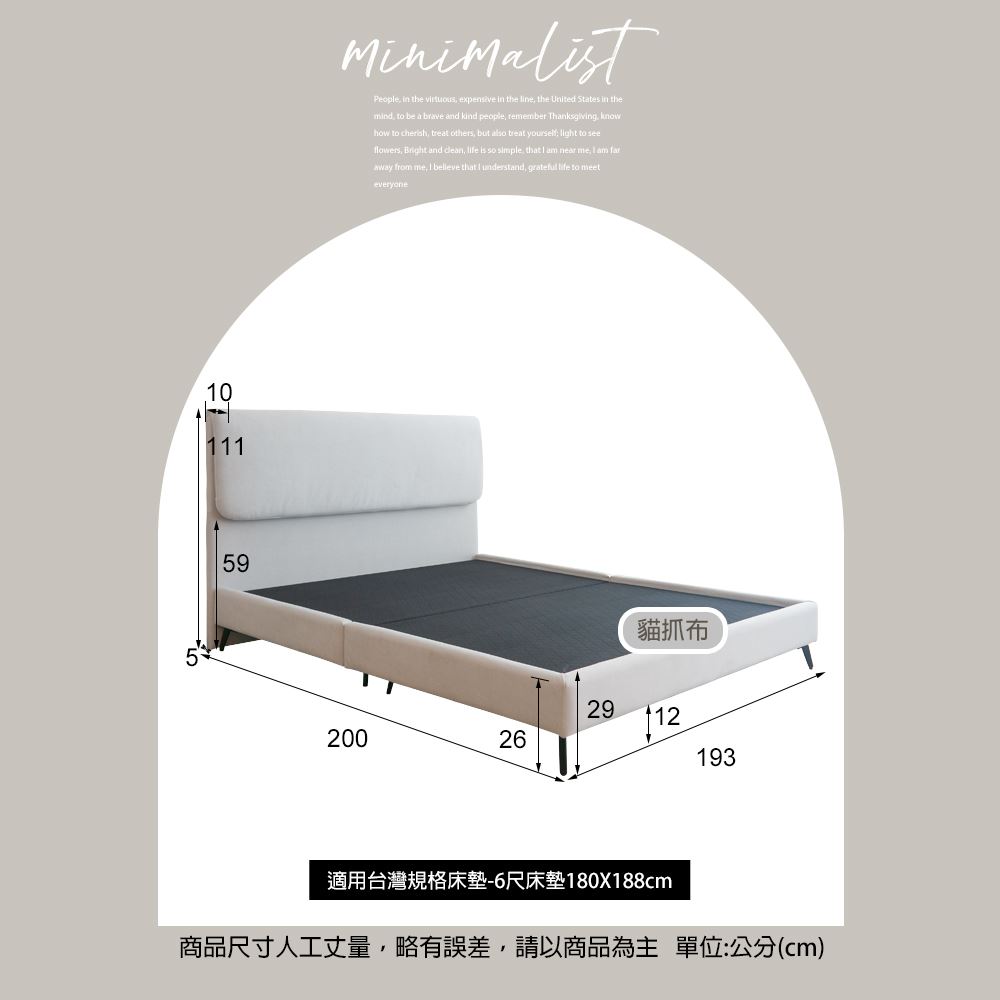 6尺(床頭片+床底):寬195X深200X高111CM(下緣到地面高度59cm)X床底高29CM(內高26cm)