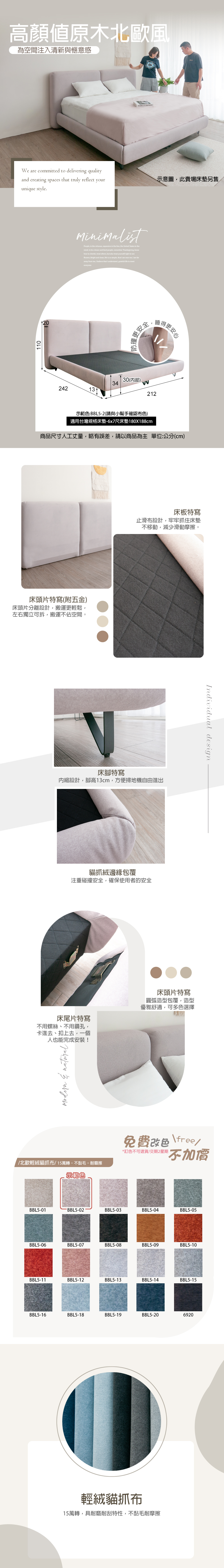 <附影片>6尺崁入式床組 (床頭片+漂浮床底) 二件組 貓抓絨床架 懸浮床架【293-QB01】