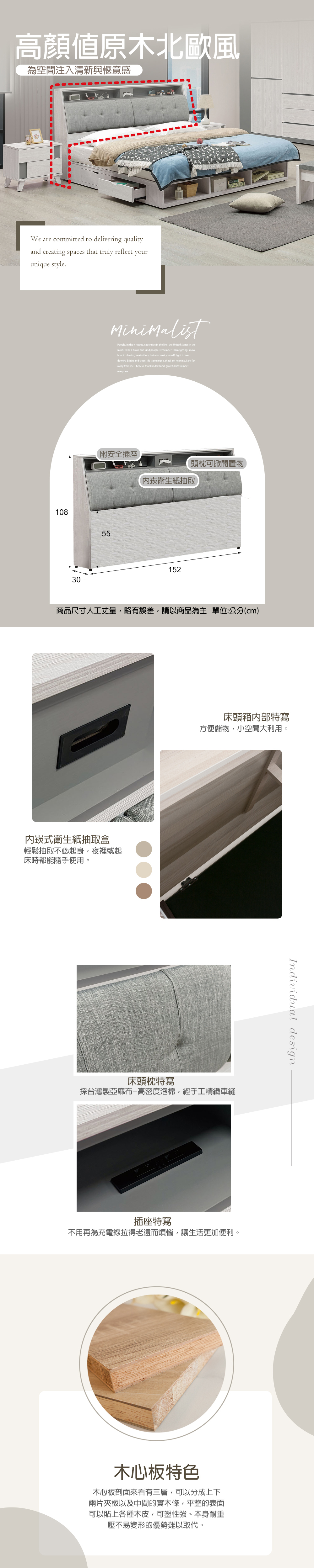 1.正面、檯面、側板與抽牆採用台灣製造A級環保木心板採專利技術同調木紋鋼刷壓紋,猶如實木質感