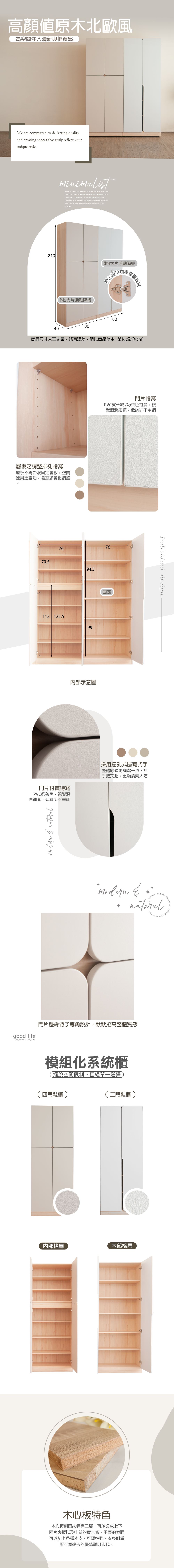 材質:1.採全環保木心板包含抽牆,經立體木紋耐磨塗裝,PVC耐磨耐水(奶茶色/白色)2.採系統式1.5mm厚封邊處理3.門片採用油壓緩衝後鈕,可自動收合4.背板採用崁入式美背設計5.台灣製造備註:2.7x7尺四門櫃:附5大片活動隔板2.7x7尺二門櫃:附4大片活動隔板
