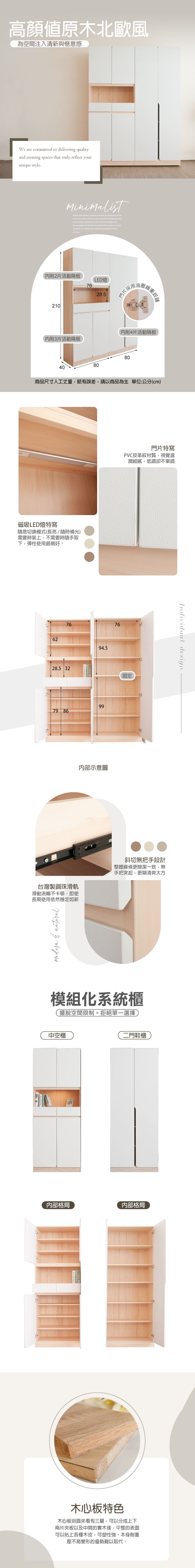 材質:1.採全環保木心板包含抽牆,經立體木紋耐磨塗裝,PVC耐磨耐水(白色)2.採系統式1.5mm厚封邊處理3.門片採用油壓緩衝後鈕,可自動收合4.抽屜採用高級鋼珠滑軌,內斜式把手5.背板採用崁入式美背設計6.台灣製造 備註:2.7x7尺中空櫃櫃:5大片活動隔板2.7x7尺二門鞋櫃:4大片活動隔板