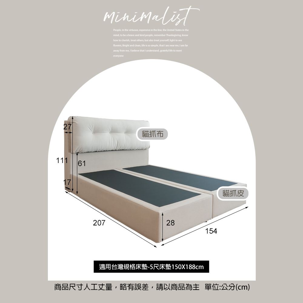 5尺(床頭片+床底):寬154x深207x高111/28(公分)