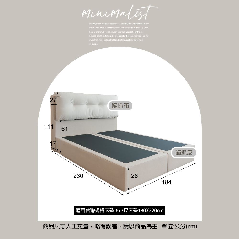 6x7尺(床頭片+床底):寬184x深230x高111/28(公分)