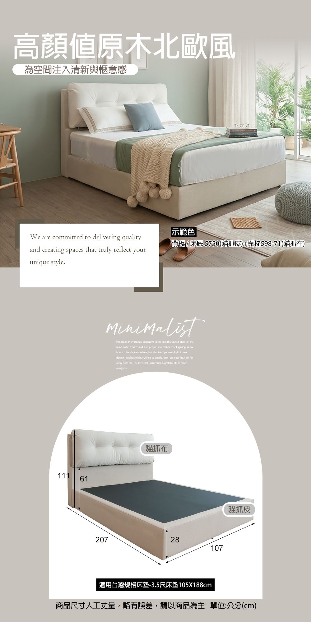 3.5尺(床頭片+床底):寬107x深207x高111/28(公分)