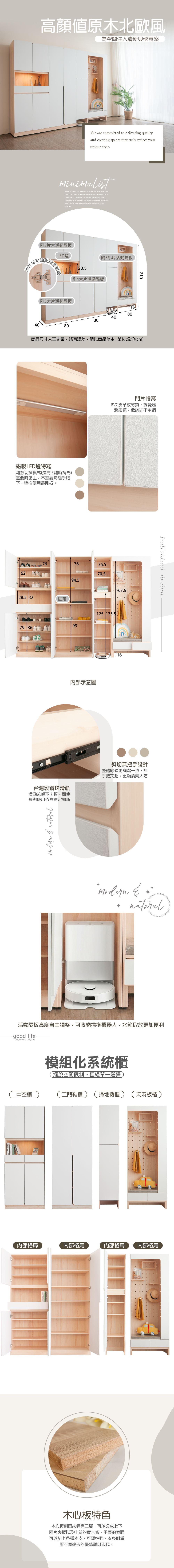 • 規格:2.7x7尺中空櫃:寬80X深40X高210CM 2.7x7尺二門櫃:寬80X深40X高210CM 1.3x7尺掃地機櫃:寬40X深40X高210CM 2.7x7尺動動板櫃:寬80X深40X高210C